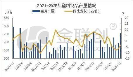 2025年12月份,国内塑料制品产量758.7万吨,同比减少3.5%,减幅较11月份缩窄了3个百分点;1—12月份,国内塑料制品产量7919.9万吨,同比减少0.2%,1—11月与去年持平。2024年累计产量7707.6万吨,同比增加2.9%。2025年累计产量增速高于低于去年全年3.1个百分点。