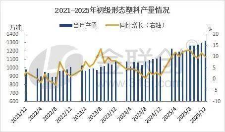 2025年12月份,国内初级形态塑料原料产量1322.6万吨,同比增加9.9%,增幅较11月份缩窄了2个百分点;1—12月份,国内初级形态塑料原料产量14792.8吨,同比增11.3%,较1—11月月缩窄了0.3个百分点。2024年1—12月份初级形态塑料原料累计产量12751.6万吨,同比增4.3%,全年初级形态塑料产量维持增长的态势。2025年,初级形态塑料产量增速大幅提高,高于2024年全年7个百分点,缘于2025年塑料原料上半年集中投产带来较大的增量。