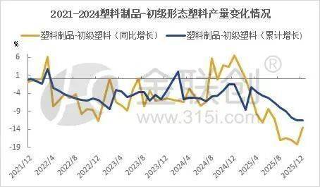 2025年,初级形态塑料产量增速大幅提高,高于2024年全年7个百分点,1-12月份,国内塑料制品产量7919.9万吨,同比减少0.2%,通过塑料制品产量增速和初级形态塑料原料增速之差又可以看出什么?