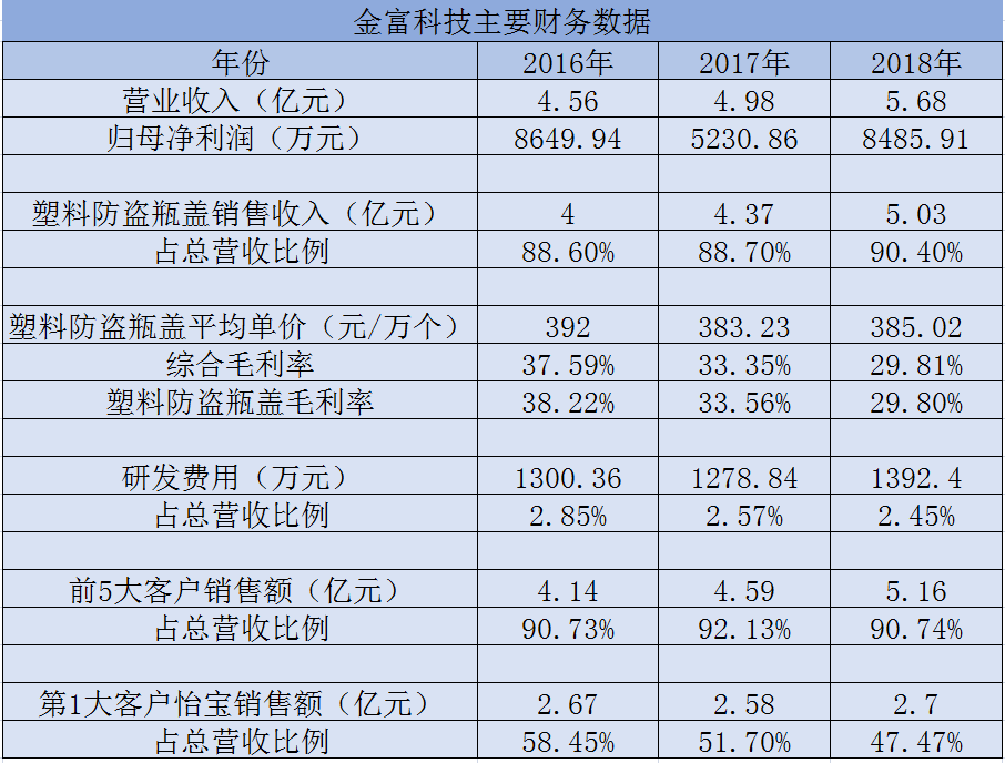 据招股书,2016年-2018年金富科技塑料防盗瓶盖贡献的营收分别达到4亿元、4.37亿元和5.03亿元,占总营收比例分别为88.6%、88.7%和90.4%,占比呈逐年上升趋势。