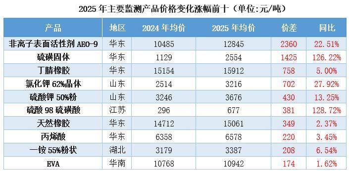 环氧乙烷行业占了1个名额(非离子表面活性剂AEO-9)。2025年非离子表面活性剂AEO-9均价大幅上涨,涨幅达22.51%。以AEO-9为例,2025年均价较2024年均价上涨达2360元/吨。虽然年内环氧乙烷价格运行区间低于往年,但棕榈仁油价格大幅上行,带动表活另一主要原料脂肪醇价格持续走高,给表面活性剂市场带来有力提振,年内国内非离子表面活性剂价格明显高于往年。
