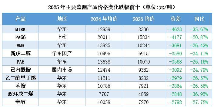 丙烯酸行业占了1个名额(MMA)。2025年国内甲基丙烯酸甲酯(MMA)下跌的主因集在于供需压力以及新装置集中投产等问题上。具体来看,2025年MMA市场创五年价格新低。全球市场共振下行,加之基本面疲软导致上下游普遍看空后市。本年度下游以及终端客户多维持谨慎采购心态,同时外需减弱内需增长不足等因素进一步加剧了价格下行的压力。